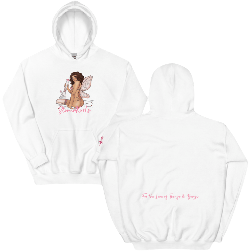 Whether you’re rolling one or just rolling with the moment, everyone needs a cozy and stylish go-to hoodie to sesh in. This hoodie is like your favorite stoner girl—soft and smooth with a touch that feels like a high you never want to come down from. Comfort you can wear and a design that will make it a fashion statement, this hoodie comes with the iconic detailed StonedKurls Fairy art print on the front, written text “for the Love of Thongs & Bongs” on the lower back & a beautiful embroidered STONEDKURLS design on the left hand sleeve. Art made by @sorrowfulsam on IG ♡
